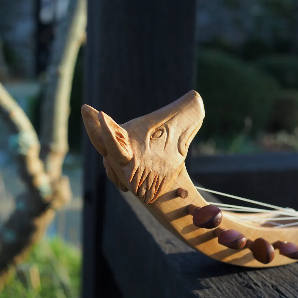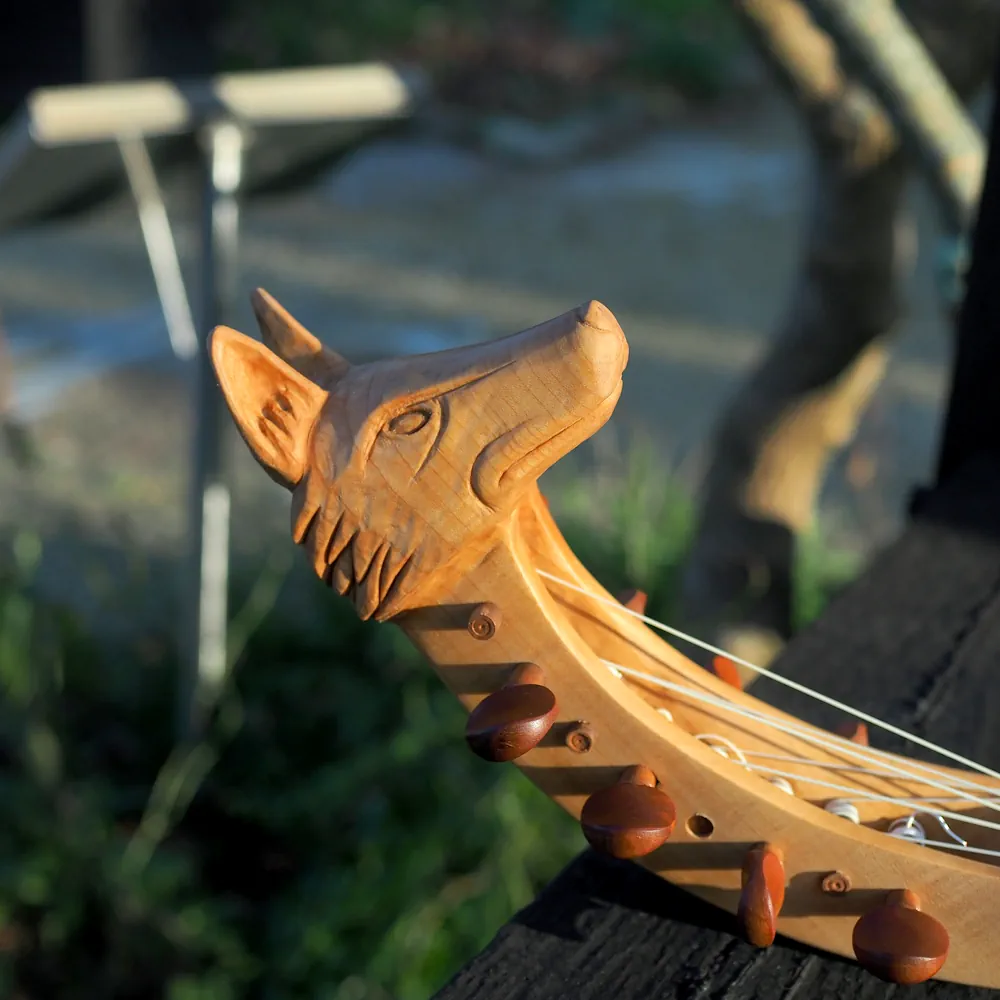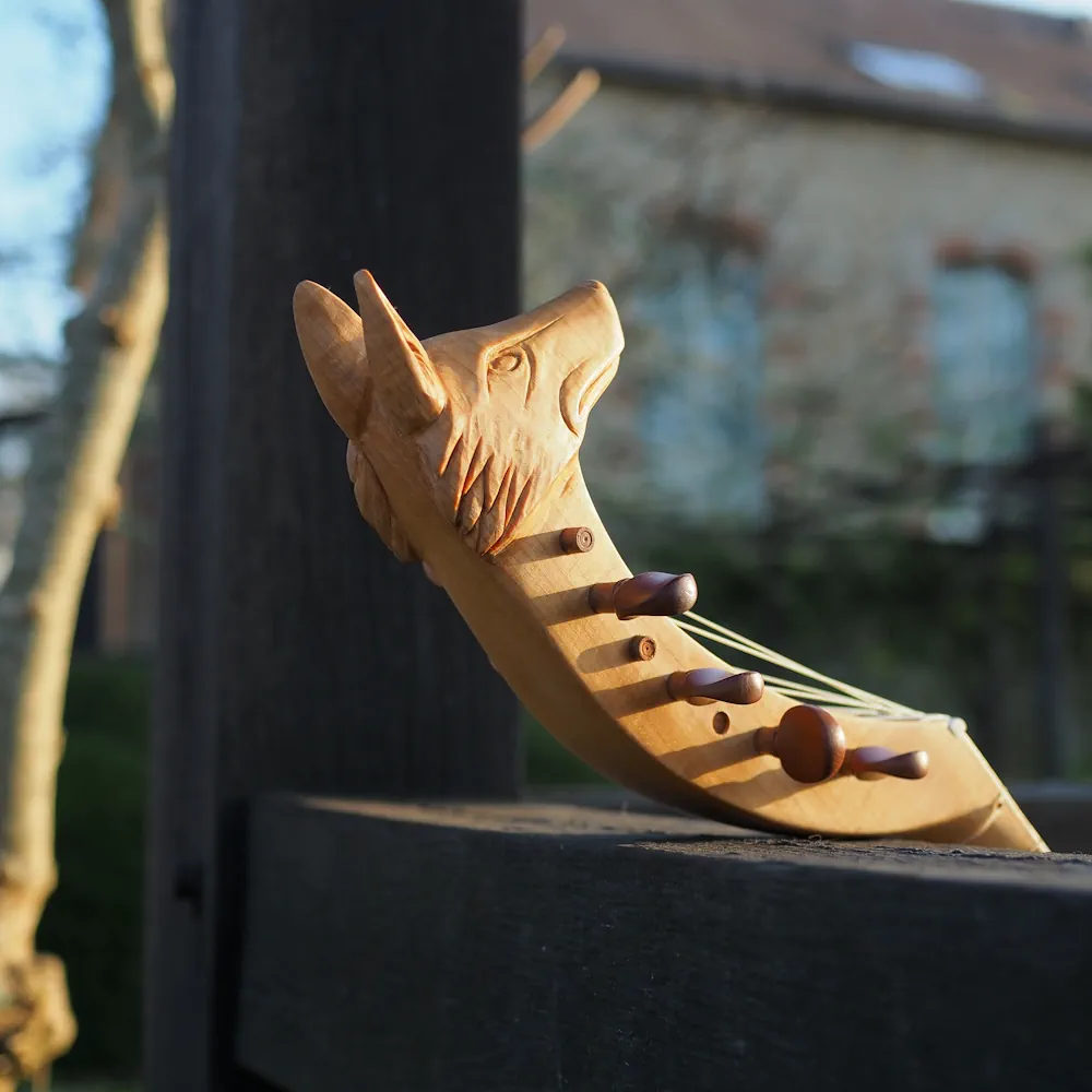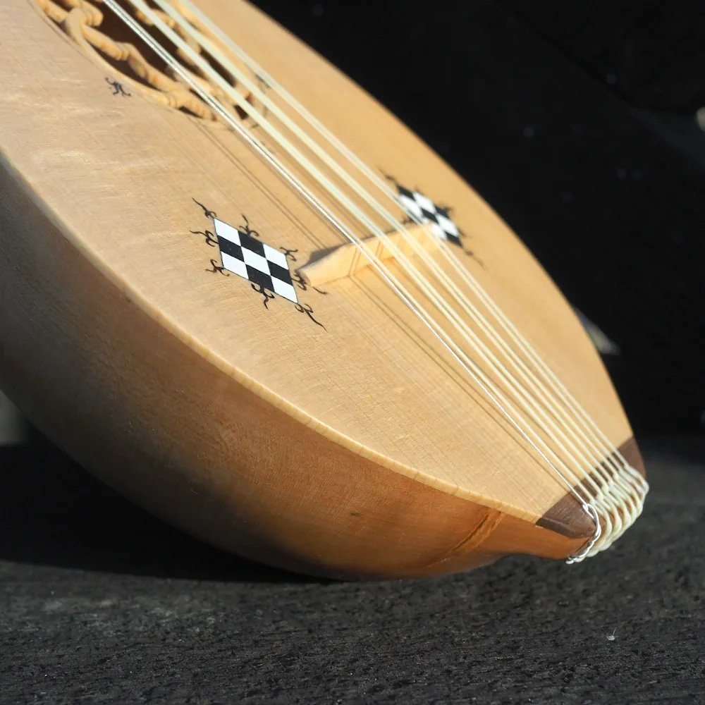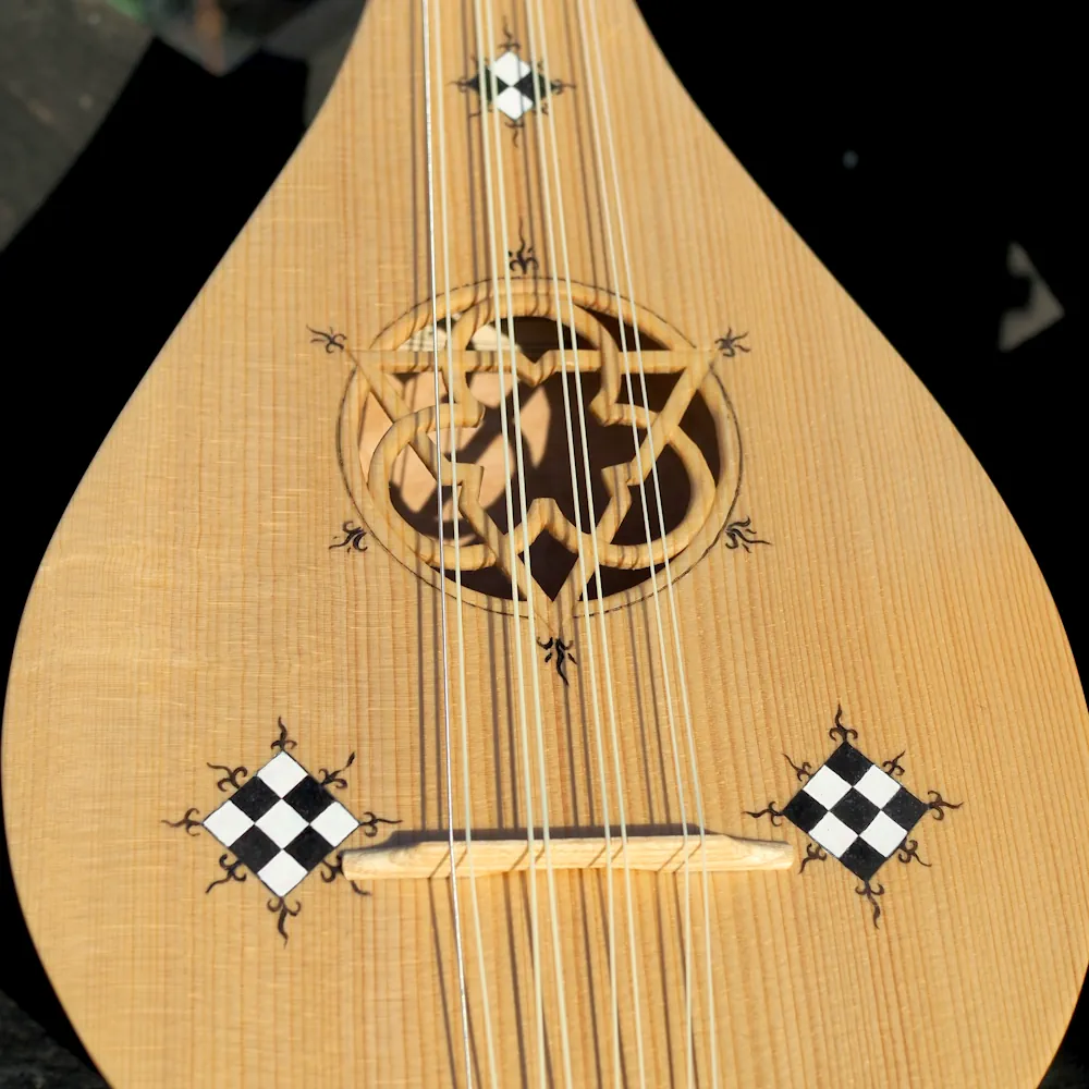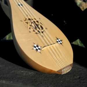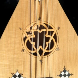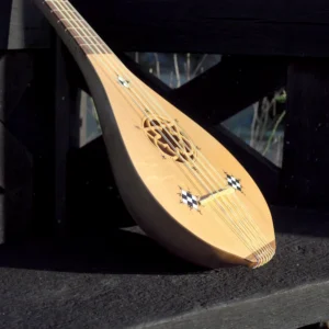 Guiterne d’après l’enluminure du Cantiga de Santa Maria daté de 1270-80. Un corps plus allongé et une touche plus courte, elle peut être équipé en 3 o 4 cordes, voir en chœurs sur demande. La sculpture de la tête est définie à la commande.